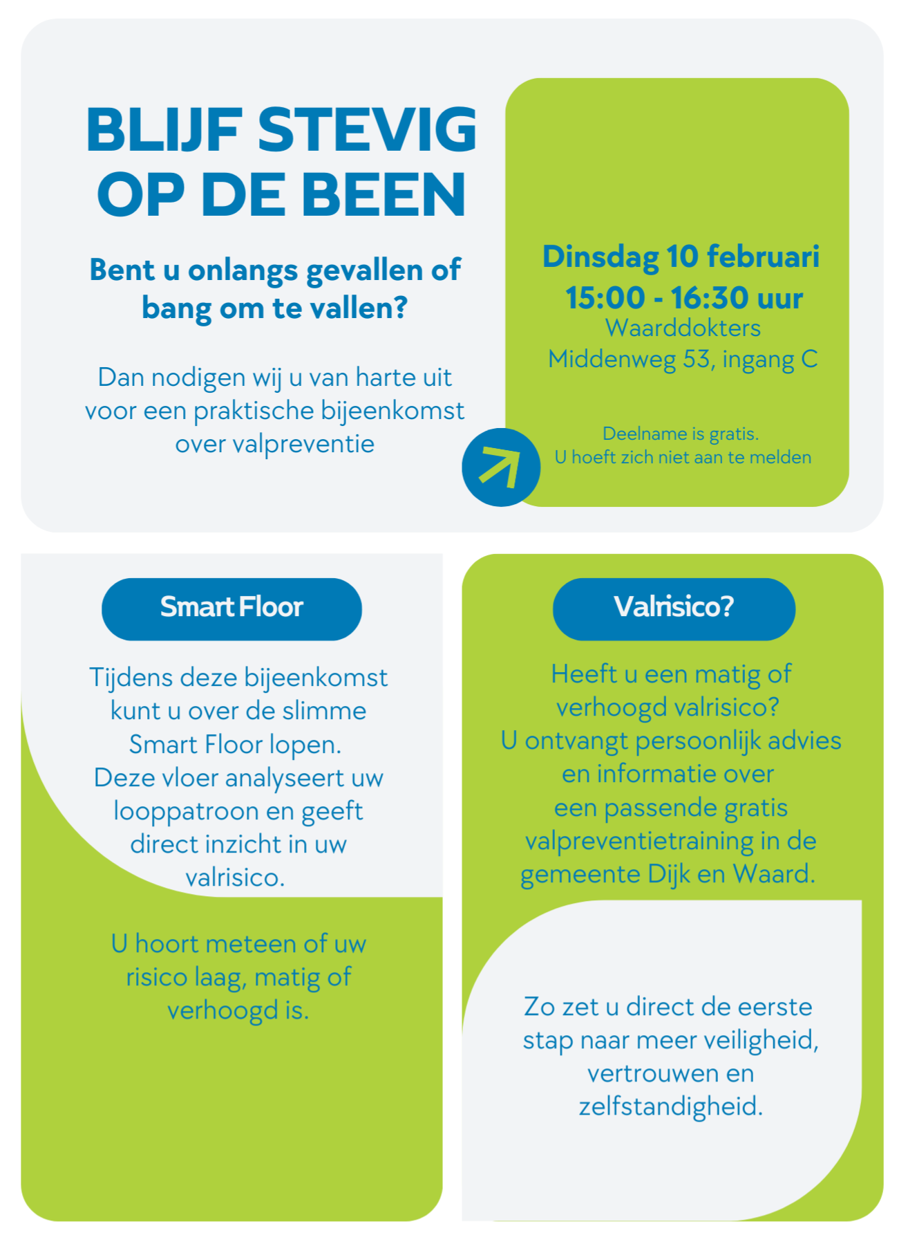 Op dinsdag 10 februari organiseren wij bij Huisartsenpraktijk Waarddokters een informatieve en praktische bijeenkomst voor mensen met een verhoogd valrisico. Tijdens deze middag krijgt u inzicht in uw balans en looppatroon en ontdekt u welke ondersteuning of training ...