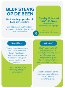 Op dinsdag 10 februari organiseren wij bij Huisartsenpraktijk Waarddokters een informatieve en praktische bijeenkomst voor mensen met een verhoogd valrisico. Tijdens deze middag krijgt u inzicht in uw balans en looppatroon en ontdekt u welke ondersteuning of training bij u past.